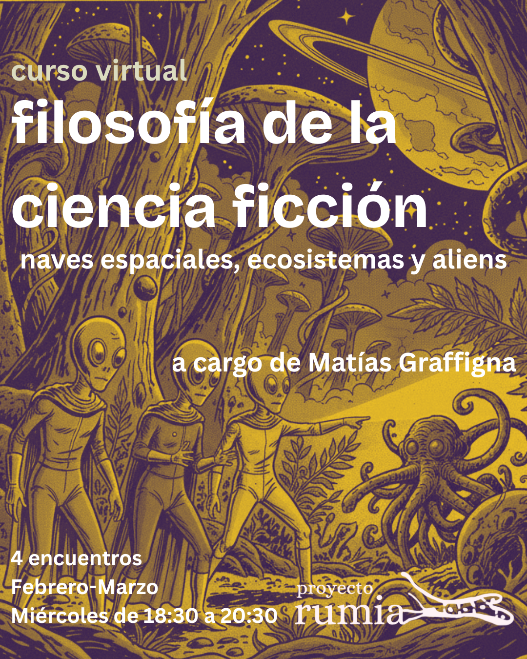 | Jan 13, 2026 | La ciencia ficción es un género que nos invita a pensar nuevos mundos, tecnologías, situaciones y posibilidades. Partiendo de lo conocido, nos adentramos en escenarios especulativos que nos exhortan a pensar acerca de nuestra realidad actual y nuestros futuros posibles. En este curso, discutiremos tanto la historia del género como algunas herramientas teóricas que nos permitirán analizar y debatir pasajes de obras de ciencia ficción de diversos autores como Úrsula K. Le Guin, Octavia Butler, Kim Stanley Robinson, Iain Banks, Michel Nieva y muchos más. 1er encuentro: historia y filosofía de la ciencia ficción. Herramientas teóricas y definiciones del género. 2do encuentro: Naves espaciales. Especulaciones teóricas y tecnológicas del género. 3er encuentro: Ecosistemas. Medioambiente, crisis climática, catástrofes y alternativas al modelo. 4to encuentro: Aliens. La figura del extraterrestre y los encuentros alienígenas. Salvación, perdición, reflejo y otredad. Fechas: Miércoles 18/02, 25/02, 4/03, 11/03. De 18:30 a 20:30 Incluye el material en formato digital. Cupos limitados. Versión presencial en Bariloche se anuncia en breve! Inscripciones abiertas y toda la info en el link. |